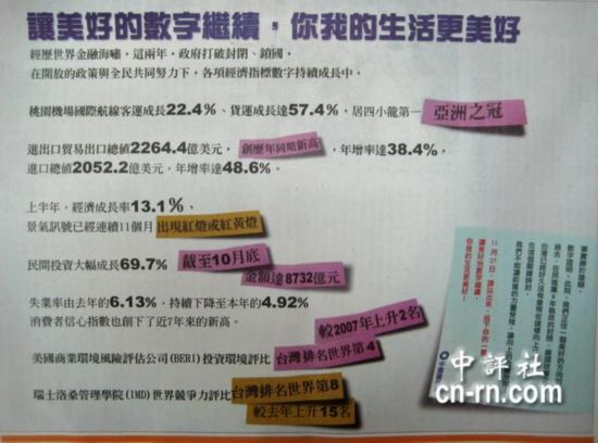 臺(tái)灣“五都”選舉競(jìng)爭(zhēng)激烈,選前兩天藍(lán)綠陣營(yíng)在各大報(bào)紙刊登廣告,大打文宣戰(zhàn)。國(guó)民黨秀出掌權(quán)各項(xiàng)經(jīng)濟(jì)指標(biāo)數(shù)據(jù),訴求讓美好的數(shù)字繼續(xù);也強(qiáng)打蘇貞昌、秋菊與扁案的關(guān)系,要求選民棄綠保藍(lán)。民進(jìn)黨臺(tái)北市長(zhǎng)候選人蘇貞昌則標(biāo)榜超越,號(hào)召迎向新世界;蘇更在三大報(bào)上預(yù)告今晚2分鐘的電視談話。