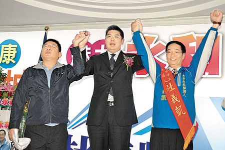林正偉案發(fā)前曾打了兩通電話給陳鴻源的競(jìng)選總干事、綽號(hào)“黑狗”的永和民眾服務(wù)社理事長(zhǎng)杜義凱(右),但杜都未接。圖為去年3月25日,參選永和市長(zhǎng)的杜義凱競(jìng)選總部成立,連勝文(中)與陳鴻源(左)為他站臺(tái)。來(lái)源:臺(tái)灣《中國(guó)時(shí)報(bào)》