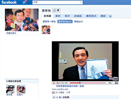 馬英九的facebook明年上線,他19日在羅智強(qiáng)的facebook上放視頻“試水溫”。 來源:臺(tái)灣《聯(lián)合報(bào)》