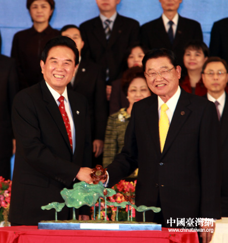 12月21日下午,海協(xié)會(huì)會(huì)長(zhǎng)陳云林與海基會(huì)董事長(zhǎng)江丙坤正式簽署《海峽兩岸醫(yī)藥衛(wèi)生合作協(xié)議》,雙方并在協(xié)議簽署后互贈(zèng)禮品。圖為海協(xié)會(huì)致贈(zèng);鶗(huì)方面的雕塑作品《好事連連》。(中國臺(tái)灣網(wǎng) 鐘寶華 攝)