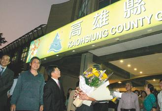 高雄縣長楊秋興昨天與高雄縣政府一同“畢業(yè)”,臨行前他回望高雄縣政府招牌最后一眼。圖片來源:臺灣《聯(lián)合報》