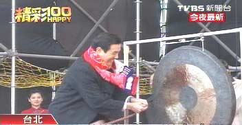 昨(1)日是元旦,為表慶祝,馬英九下午大筆一揮,當(dāng)眾揮毫漢字;寫完毛筆,馬英九架勢(shì)十足的欲敲吉祥鑼鼓,還蹲馬步用力一敲,未料用力過猛將鼓棒敲“飛”,惹得現(xiàn)場(chǎng)人員大笑不止。隨扈見此連忙將鼓棒撿回,馬英九則重敲鑼鼓。