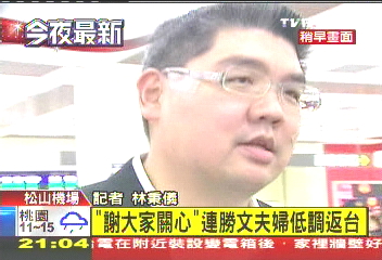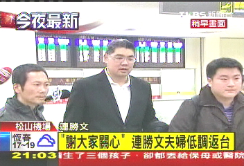 連勝文11月26日晚助選國(guó)民黨新北市議員參選人陳鴻源時(shí)遭槍擊,受傷后連勝文十分低調(diào),只以戴口罩的面貌出現(xiàn),日前到上海復(fù)診腎臟腫瘤,今晚返回臺(tái)灣時(shí),卻未戴口罩,全臉曝光。