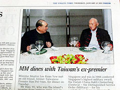 新加坡的“聯(lián)合早報”及“海峽時報”今天刊登郝李2人會面照片,新加坡官方提供的照片顯示,李光耀11日在一家餐館宴請郝柏村,2人相談甚歡,顯示交情深厚。