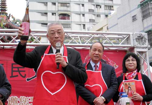 此外,吳敦義認(rèn)真料理之余,不忘為臺(tái)灣煙酒公司生產(chǎn)的料理米酒打廣告,逗得現(xiàn)場(chǎng)民眾笑得合不攏嘴。