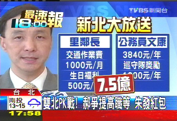 中國(guó)臺(tái)灣網(wǎng)1月21日消息 據(jù)臺(tái)灣TVBS電視臺(tái)報(bào)道,臺(tái)北市、新北市近日在提升公務(wù)人員待遇方面相互較勁,臺(tái)北市長(zhǎng)郝龍斌表示,他要幫臺(tái)北市的公務(wù)人員爭(zhēng)取職等升級(jí),理由是臺(tái)北市業(yè)務(wù)量龐大,應(yīng)該給公務(wù)人員更好的福利。同樣,新北市長(zhǎng)朱立倫也決定給公務(wù)人員發(fā)“紅包”,包括基層的鄰、里長(zhǎng)和警察及消防員等,每個(gè)月發(fā)放1000元(新臺(tái)幣,下同)交通補(bǔ)助,并增加他們的文康費(fèi)用。郝龍斌、朱立倫兩人替基層謀福利,更像是臺(tái)北市與新北市在爭(zhēng)取領(lǐng)頭地位。