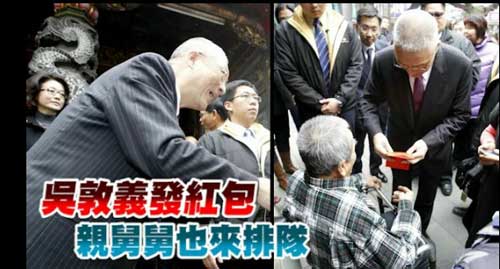 吳敦義昨天抵達(dá)臺(tái)中市豐原區(qū)慈濟(jì)宮,上香后發(fā)888個(gè)紅包給民眾,取其吉利諧音“發(fā)發(fā)發(fā)”,吸引大批當(dāng)?shù)孛癖娕抨?duì)領(lǐng)取。82歲的簡(jiǎn)百祿雙手握著輔助架,在女兒攙扶下領(lǐng)到一個(gè)紅包,此時(shí)吳敦義突然喊他“舅舅”。報(bào)道指出,原來簡(jiǎn)老先生是吳敦義的親母舅,吳敦義隨即又包了近10張的新臺(tái)幣千元鈔紅包給舅舅,并說:“這是我的錢,沒有問題啦!”