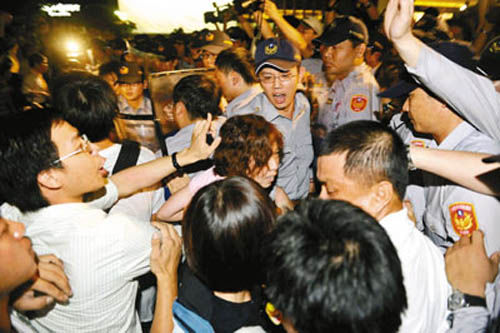 資料圖:2008年11月,陳云林赴臺(tái),民進(jìn)黨煽動(dòng)綠營(yíng)民眾鬧事數(shù)百人用石塊、棍棒攻擊警察,深夜還有人擲汽油彈形成火海。7日凌晨,鎮(zhèn)暴噴水車(chē)朝現(xiàn)場(chǎng)噴水柱強(qiáng)制驅(qū)離人群。這場(chǎng)流血事件,堪稱(chēng)臺(tái)灣近十年來(lái)最嚴(yán)重的警民沖突。