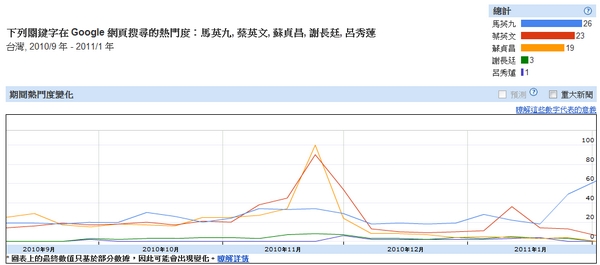 谷歌臺灣的Google Insight(搜尋透視)上,馬英九近來人氣飆升,穩(wěn)居第一。其中,藍(lán)色上揚(yáng)的線為馬英九的“人氣線”。網(wǎng)絡(luò)截圖