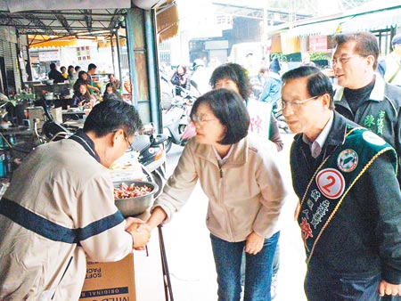 民進黨提名的臺南“立委”補選參選人許添財,昨天上午由蔡英文陪同前往市場拜票。
