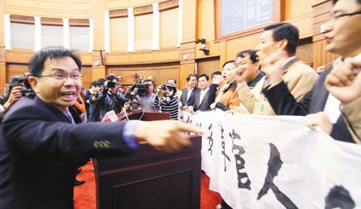 臺中市議員為了夜店大火案,昨天要求市長胡志強(qiáng)報(bào)告,并拉起白布條表達(dá)立場。無黨籍市議員陳清龍(左)指著民進(jìn)黨議員大罵干擾議事進(jìn)行。圖片來源:臺灣《聯(lián)合報(bào)》