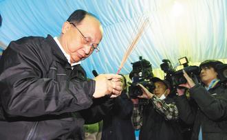 臺中市長胡志強(qiáng)昨天到殯儀館向臺中夜店大火中不幸罹難者上香,他沉重地說“大悲無言”,會全力照顧家屬。圖片來源:臺灣《聯(lián)合報》