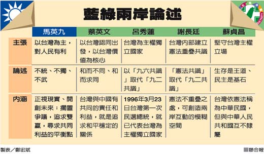 2012臺(tái)灣地區(qū)領(lǐng)導(dǎo)人選舉燃起戰(zhàn)火,藍(lán)綠雙方都紛紛拋出自己的“兩岸論述”,圖為臺(tái)灣《聯(lián)合報(bào)》制作。