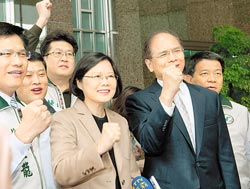 積極走訪▲民進黨主席蔡英文(右二)18日拜會臺當局前“行政院長”游錫堃(右),受到游錫堃與多位市議員迎接,游錫堃與眾人隨即握拳大喊“加油!”圖片來源:臺灣《中國時報》
