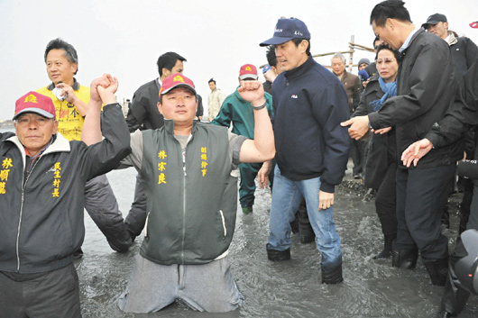 中國臺灣網(wǎng)4月5日消息 據(jù)臺灣《聯(lián)合報》報道,臺灣地區(qū)領(lǐng)導(dǎo)人馬英九與臺當(dāng)局“內(nèi)政部長”江宜樺等人,4日由彰化縣環(huán)保聯(lián)盟成員帶領(lǐng),坐著采蚵車前往大城濕地巡視;海灘前,一群反“國光石化”的民眾舉起“濕地石化無法并存”、“國光石化撤案,濕地才有未來”的布條,甚至有人跪在海灘中,向馬英九宣示保護(hù)濕地的決心。