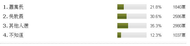 臺(tái)灣Yahoo!奇摩網(wǎng)在馬英九2012副手民調(diào)選項(xiàng)中設(shè)置4個(gè)選項(xiàng)。一是支持蕭萬長(zhǎng);一是支持吳敦義;一是其他人選;一是不知道。經(jīng)過8443人的投票,結(jié)果于今日出爐。