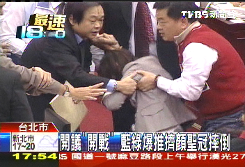 報(bào)道稱,藍(lán)綠議員在議場(chǎng)中間拳腳相向,推來(lái)擠去,場(chǎng)面像在打軟式橄欖球。沖突中,民進(jìn)黨議員顏圣冠倒退時(shí)摔倒,臉頰被一旁麥克風(fēng)劃傷。