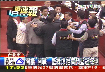 據(jù)報(bào)道,臺(tái)北市議會(huì)今(12)日第一天開(kāi)議,郝龍斌前往接受質(zhì)詢。民進(jìn)黨議員發(fā)動(dòng)攻勢(shì),以最近發(fā)燒的“大法官”事件,要求郝龍斌自清,藍(lán)綠雙方為此激烈攻防。民進(jìn)黨籍議員王世堅(jiān)則展現(xiàn)罕見(jiàn)大動(dòng)作,拿著臺(tái)北市政報(bào)告書(shū)沖到備詢臺(tái),要退給郝龍斌以表達(dá)不滿。這一做法激起藍(lán)營(yíng)議員不滿,藍(lán)營(yíng)議員集體出面“護(hù)駕”,綠營(yíng)議員則瞬間一涌而上展開(kāi)拳腳、推擠群戰(zhàn)。