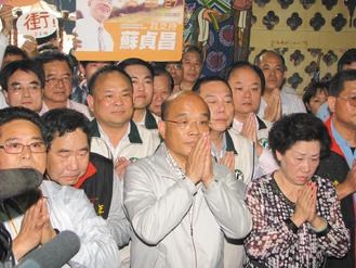 卡神民調(diào)外泄事件,蘇貞昌(前排中)昨天到新北市新莊區(qū)福德宮參拜,指出不能公布民調(diào)很明確,沒有灰色地帶。