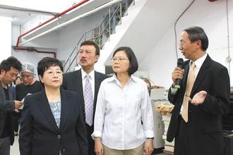 蔡英文(右二)昨天參訪社福機(jī)構(gòu)時(shí)神情緊繃,她指出楊蕙如泄漏民調(diào),自己也是受害者。