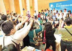 新北市政府29日舉辦大市長與小市長的高峰對談,小市長會后與大市長朱立倫合影,臺下小市長的爸爸、媽媽們,則拿著相機搶著為兒女留下這值得紀(jì)念的一刻。圖片來源:臺灣《中國時報》