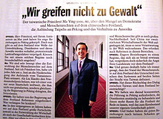 德國(guó)《明鏡》周刊4月下旬在臺(tái)北專訪馬英九,談兩岸關(guān)系的發(fā)展、“臺(tái)美中三邊關(guān)系”及亞洲的新形勢(shì)。