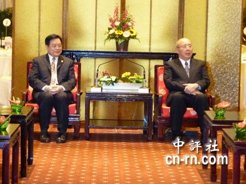 國(guó)民黨榮譽(yù)主席吳伯雄(右)22日晚間宴請(qǐng)四川省長(zhǎng)蔣巨峰(左)。圖片來(lái)源:香港“中評(píng)社”