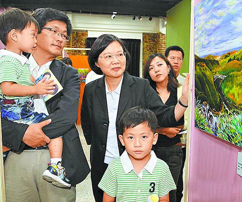 蔡英文27日在輔選會頻動怒,隨后轉(zhuǎn)換心情欣賞已故畫家張淑玫畫展,張淑玫的丈夫、幼兒一路陪同。圖片來源:臺灣媒體