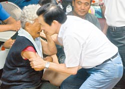 昨天,馬英九來到臺南臺風重災區(qū)恒春鎮(zhèn)慰問災民,一老人談到水淹家園時,不禁淚流滿面,馬英九當即給予一個溫暖的擁抱。圖片來源:《中國時報》
