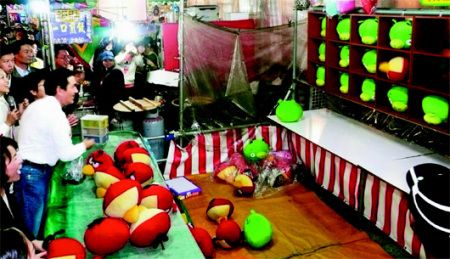 馬英九(左)昨晚在嘉義夜市手拿“憤怒鳥”投擲綠色小豬,“三只小豬”應(yīng)聲倒地,馬英九振臂為自己喝采。(圖片來源于:臺灣《聯(lián)合報》)