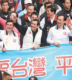 國民黨2012年臺灣地區(qū)領(lǐng)導人候選人馬英九上午和臺灣地區(qū)副領(lǐng)導人候選人吳敦義“合體”在臺中催票,下午,奔回臺北領(lǐng)軍游行,人數(shù)估計超過20萬人;晚間馬英九再深入敵營,殺到臺南舉行造勢晚會,展現(xiàn)連任氣勢。