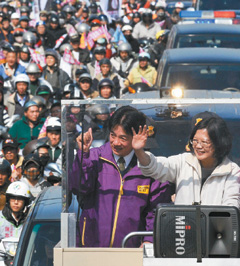 民進黨臺灣地區(qū)領(lǐng)導人候選人蔡英文(車上右)在臺南市長賴清德(車上左)陪同下,昨天在臺南市掃街。圖片來源:臺灣《聯(lián)合報》