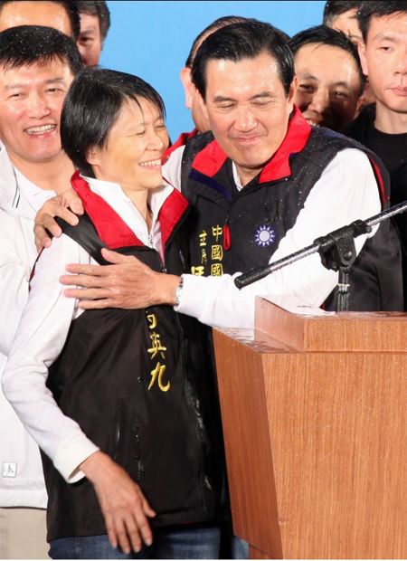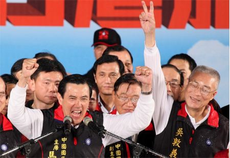 馬英九與副手吳敦義上臺并高舉雙手發(fā)表談話。他表示,“恭喜大家,我們贏了”!。▓D片來源:臺灣《中時電子報》)