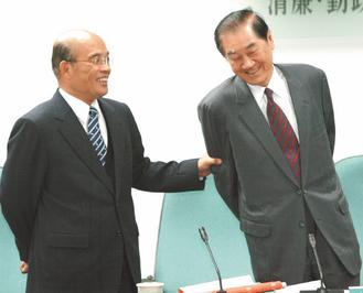 陳唐山(右)8日呼吁,選過正、副臺灣地區(qū)領(lǐng)導(dǎo)人的人,不該再出來了,外界解讀暗批蘇貞昌(左)。對照兩人昔日在民進(jìn)黨中常會中有說有笑,形成強烈對比。 來源:臺灣《聯(lián)合報》
