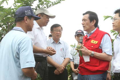 馬英九到臺(tái)東知本了解釋迦、香蕉等作物受害情形,指示補(bǔ)助從速、認(rèn)定從寬、程序從簡(jiǎn)等原則,助農(nóng)民度過難關(guān)。(中國臺(tái)灣網(wǎng) 周劍)