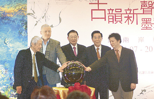 “古蘊新生·墨彩華章”兩岸書畫展昨天在臺北圓山飯店開幕,前海基會董事長江丙坤(中)、陜西省西安美院國畫系主任姜怡翔(左二)、臺灣油畫大師陳景容(左一)、中華經(jīng)貿(mào)文創(chuàng)交流協(xié)會理事長江清香兼、藝術(shù)家劉俊成(右一)等人共同啟動。(來源:臺灣《旺報》)