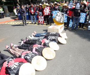 臺(tái)灣關(guān)廠工人社團(tuán)演出行動(dòng)劇表達(dá)訴求。(圖片來自臺(tái)媒)
