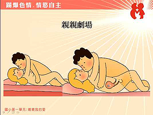 投影片簡單敘述男女談戀愛、結(jié)婚過程,然后便以可愛的畫風(fēng),介紹男女性器官的不同。“男上女下”的性交過程,以及精子進(jìn)入子宮的示意圖,也毫不避諱地畫出。至于鮮少出現(xiàn)的嬰兒出生畫面,該教材也沒遺漏,漫畫一一交代嬰兒從母親兩腿間出生的情形,以及母親擁抱新生兒的喜悅。