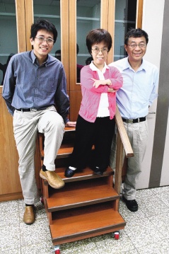 臺灣“中央大學”網(wǎng)絡(luò)學習科技研究所教授陳攸華(中),因身高“迷你”,校方為她特制小樓梯上課,左右兩人分別為力邀她回臺灣的副教授劉晨鐘和教授陳德懷。來源:臺灣《聯(lián)合報》
