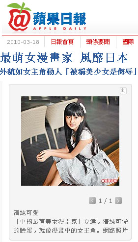 中國臺灣網(wǎng)3月18日消息 “水汪汪的大眼睛、無辜眼神,配上惹人憐愛的表情”,“一頭烏黑的長發(fā),空靈的氣質(zhì),看起來就像是從漫畫中走出來的少女”,這些都是臺灣媒體近幾天來報道大陸美女漫畫家夏達時使用的詞句。早已征服日本漫畫迷的夏達,也在寶島刮起一陣旋風。