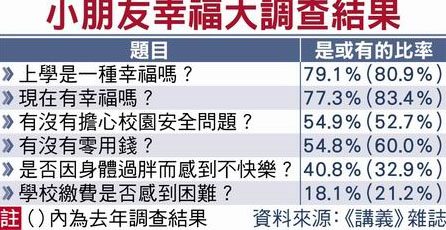調(diào)查結(jié)果顯示,約77%受訪學(xué)童覺(jué)得幸福,比率是繼2004年的74%及2003年的76%之后,調(diào)查進(jìn)行十年來(lái)的第三低。臺(tái)灣小學(xué)生覺(jué)得幸福的主因是“溫暖的家、與父母同樂(lè)”,不幸福的原因則是課業(yè)問(wèn)題。