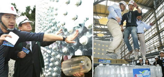 臺灣每年產(chǎn)生24億個以上的廢棄寶特瓶,但回收再利用的寶特瓶僅占4%,其余均變成永久不壞的垃圾,嚴(yán)重破壞環(huán)境。兩年前臺灣遠(yuǎn)東集團(tuán)透過旗下各個通路,向全臺民眾總共回收多達(dá)150萬個廢棄寶特瓶,經(jīng)過清洗、打碎和融化等步驟制成獨(dú)特的寶特瓶建材,并采用許多環(huán)保和建筑新技術(shù),以達(dá)到抗風(fēng)壓和隔熱保溫效果,打造出寫下7項世界第一紀(jì)錄的遠(yuǎn)東“環(huán)生方舟”。