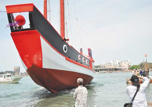 仿鄭成功時(shí)期戰(zhàn)船打造的“臺(tái)灣船”昨天在臺(tái)南市安平港下水,市民搶著拍照,見證歷史一刻。圖片來(lái)源:臺(tái)灣《聯(lián)合報(bào)》