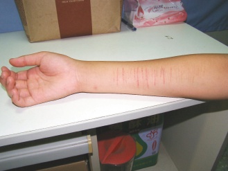 學(xué)校輔導(dǎo)室老師昨天找小雅、小娟等人了解事件經(jīng)過(guò),發(fā)現(xiàn)小雅右臂有密集刀痕,嚇了一跳。小雅一臉不在乎說(shuō):“割手腕又不會(huì)死人,兩年來(lái)我已經(jīng)割了200多刀!