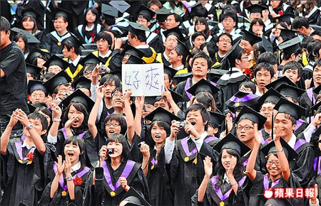 臺大舉行畢業(yè)典禮,畢業(yè)生高舉“好爽”的牌子表達(dá)愉悅心情。 來源:臺灣《蘋果日報》