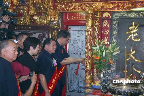 資料圖:2007年8月13日,傳承一百五十三年的基隆中元祭,當(dāng)日下午進行俗稱“開鬼門”的開龕門儀式,象征“鬼月”到來。圖為當(dāng)年的主祭者——黃姓宗親會理事長打開龕門門鎖。 中新社發(fā) 曾嘉 攝