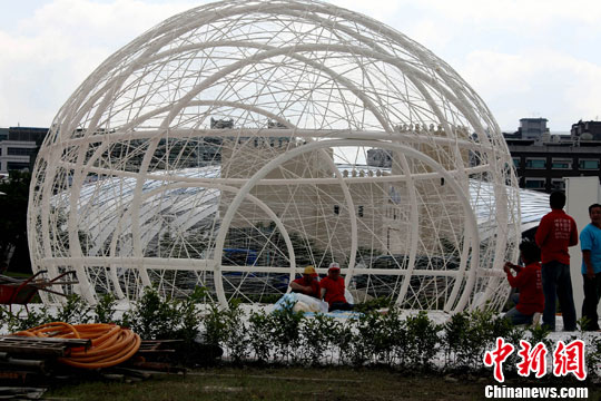 圖為寰宇庭園區(qū)內(nèi)西班牙人設(shè)計(jì)的蠶繭造型作品,正在進(jìn)行最后的纏繞蠶絲布置。王健 攝
