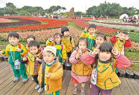 臺北花博16日進入開館第11天,幼兒園的小朋友們首次來到新生園區(qū)參觀,開心地在花海前合影留念。 圖片來源:臺灣《中國時報》