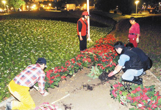 花博昨晚在結(jié)束參觀后連夜換花,出動大批工作人員,將圓山園區(qū)的地景花海換成圣誕紅。圖片來源:臺灣《聯(lián)合報》