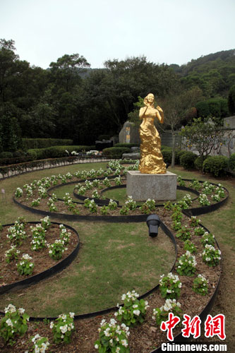 在臺北金寶山鄧麗君墓園——“筠園”里,一片點綴著音符微雕的草地上,鄧小姐裙裾飄飄的雕塑泛著金光,一如她的歌聲已是一代人金色的記憶。中新社記者 關(guān)向東 攝